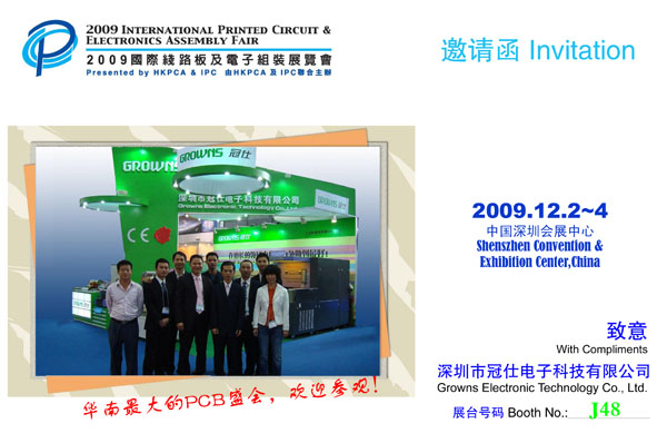 我公司将参加2009国际电子组装展览会(HKPCA),展位号:J48,欢迎参观指导!